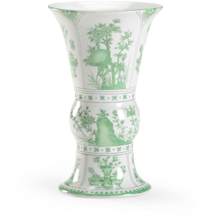 Hand-painted green porcelain vase from Chelsea House. 12"h x 7.5"dia. Brought to you by deGuise Interiors.
