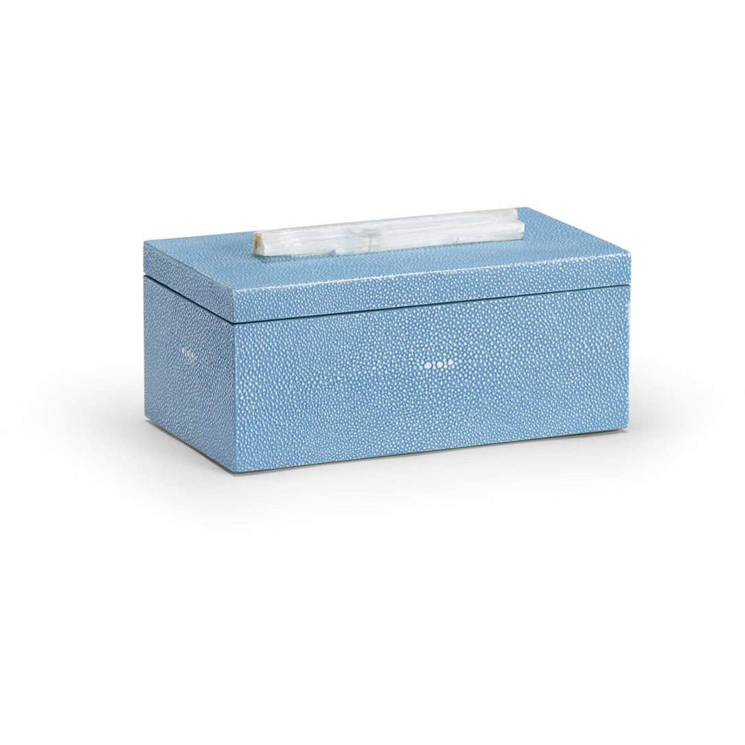 This box from Chelsea House is light blue shagreen covered wood with a rock crystal...