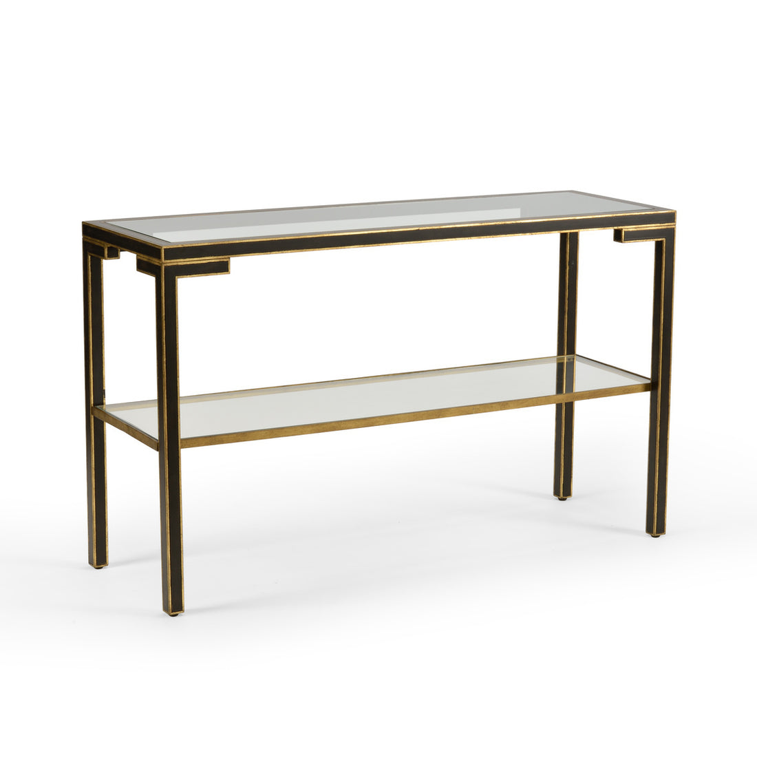 Decker Console GLASS TOP AND SHELF OLD GOLD TRIM-BLACK FRAME (DISTANCE BETWEEN SHELVES: 14") Overall...