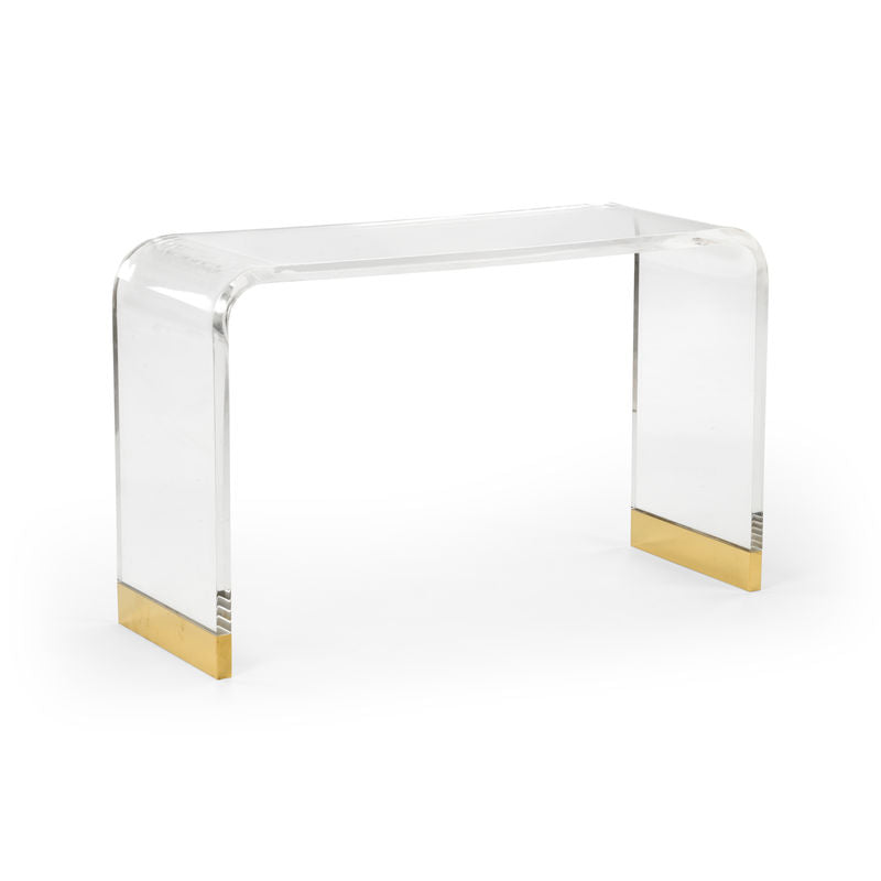 Waterfall Console 1-1/8" THICK CLEAR ACRYLIC CONSOLE WITH WATERFALL EDGE ANTIQUE BRASS FEET Overall Dimensions 28.5h...