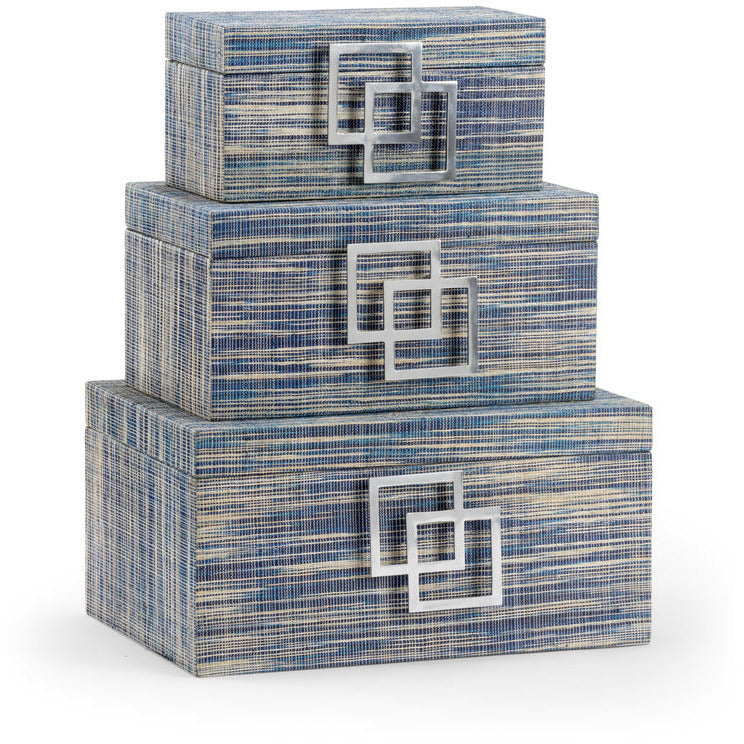 Wildwood set of three boxes wrapped in hand-dyed and hand-woven abaca with brushed nickel hardware. Brought...