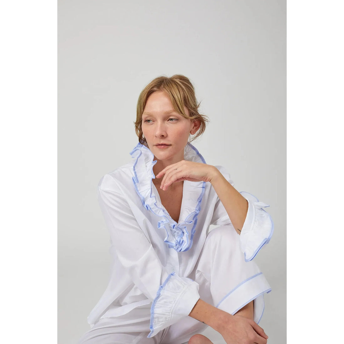 St. Moritz Pajamas 100% White Cotton Sateen pajamas Ruffle neck and sleeve Available in ice blue...