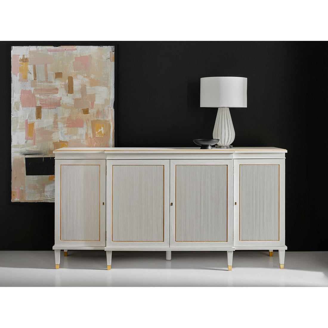 Swedish Reeded Breakfront Cabinet Dimensions: 62w x 12.5d x 36.5h Features: Antiqued Gold Leaf Accent Materials: White Painted...