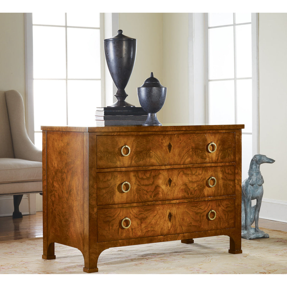 This chest of drawers features burly French walnut veneers, inlaid brass keyhole covers, round brass...