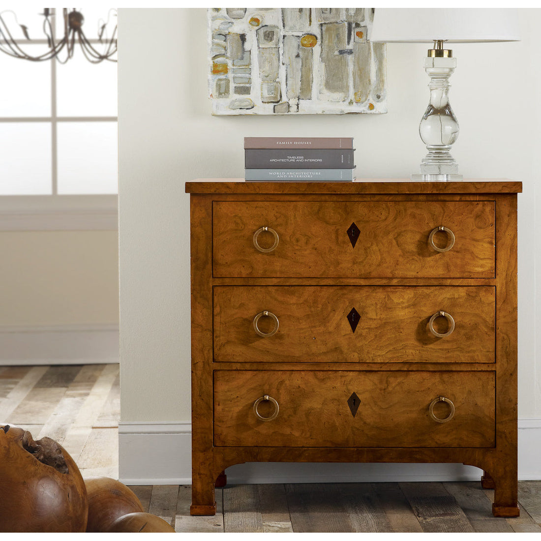 Three-drawer bedside chest with burly French walnut veneers. Light chaining detail. Brass pulls and inlaid...