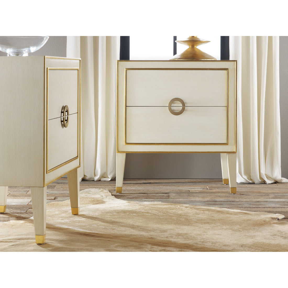 Solid wood nightstand with an antique cream painted finish and gold leaf trim. Solid brass...