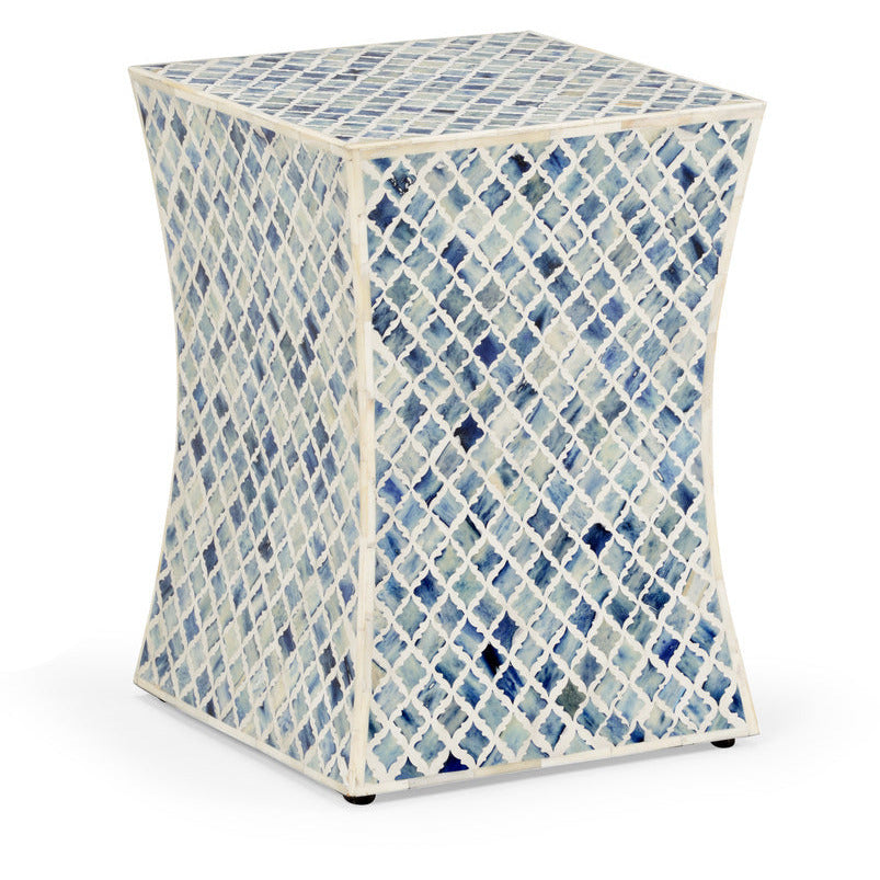 Chelsea House wood side table with white and blue bone inlay in a herringbone pattern....