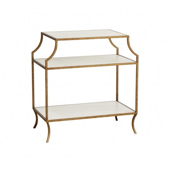 This elegant side table features three wooden tiers, a metal frame, and saber legs.**The lead...
