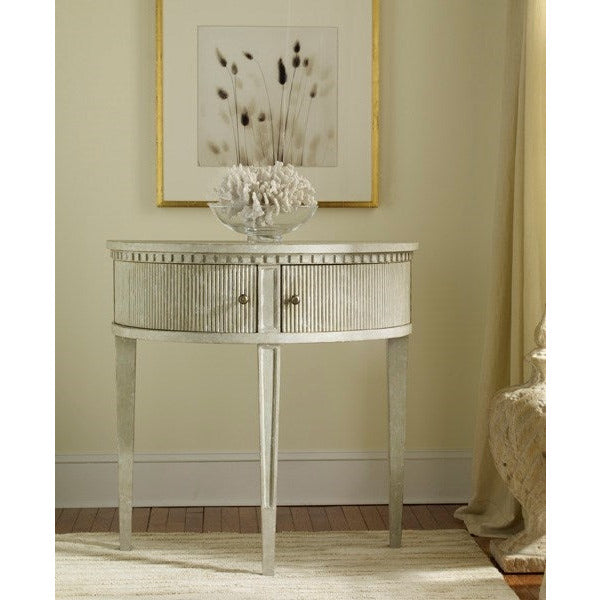 A demilune console featuring a textured facade on two facing cabinets and three tapered legs.Handcrafted...