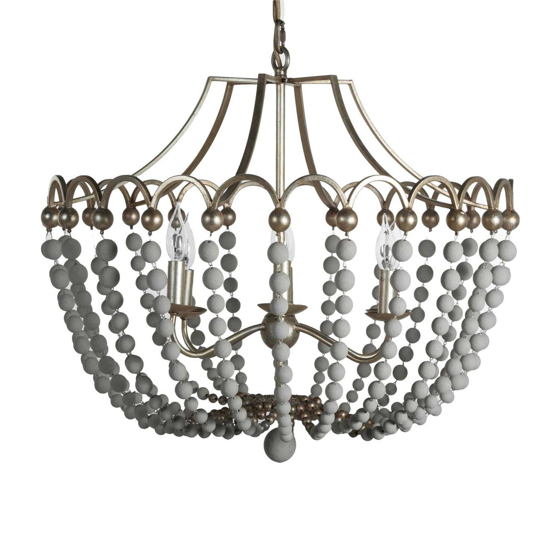 6 bulb chandelier with Champagne Silver and Dove White finish and cascading wooden beads. Max...
