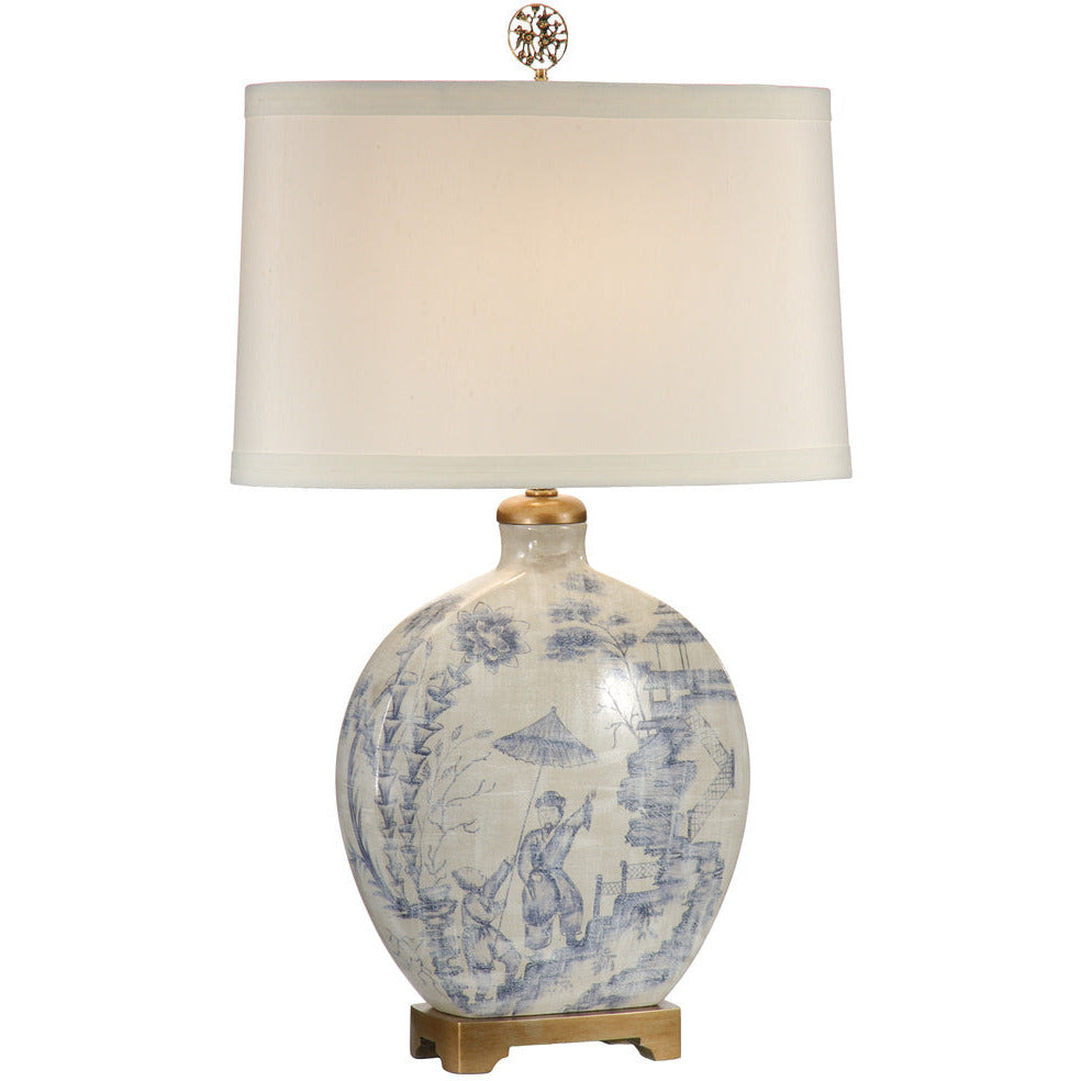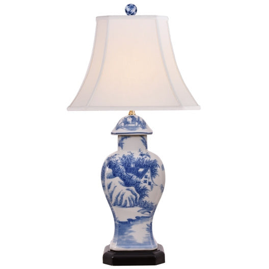 Blue and white jar lamp on a black stand. Bell rectangle cut corner shade in...