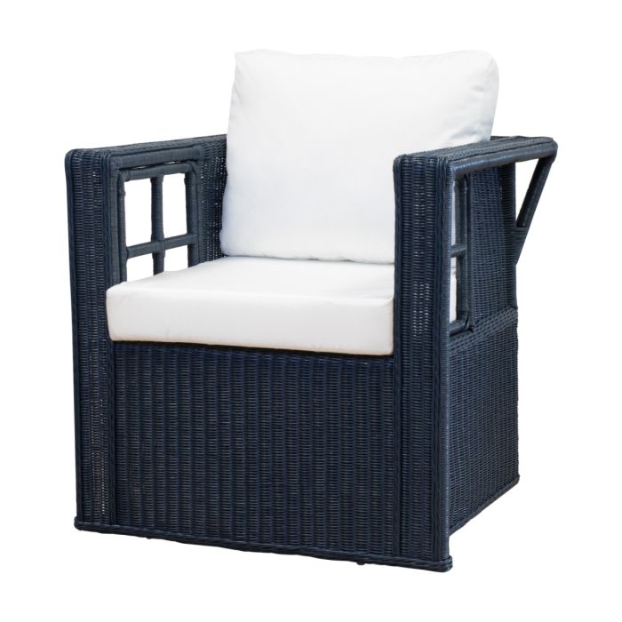 Asian inspired rattan wing chair with a pure white glossy finish. A cushion and lumbar...