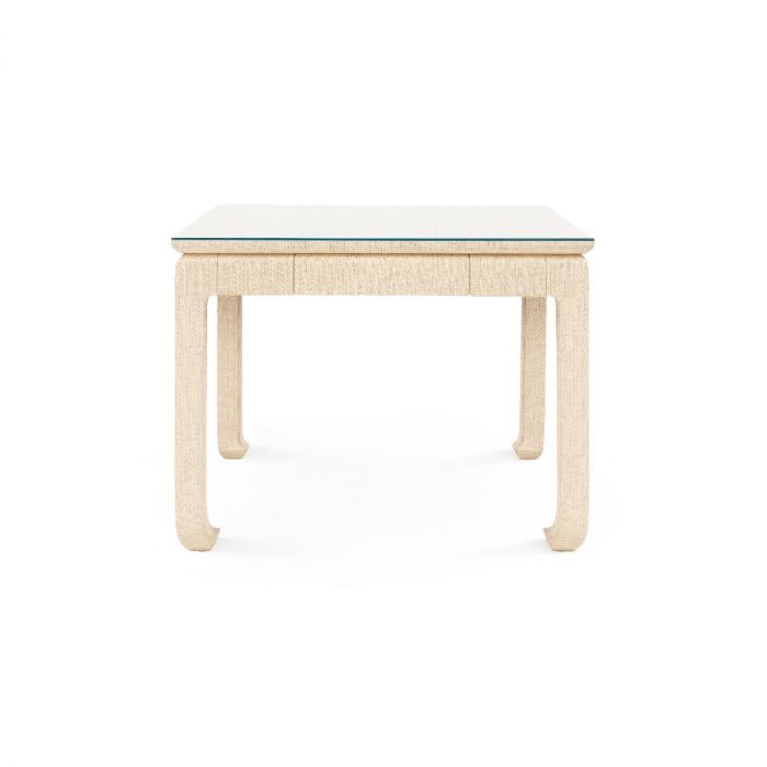 With harmonious proportions and chow-styled feet, the Bethany Game Table is a substantial piece. Finished in a textural, lacquered heavy linen that almost reads like plaster, the Bethany has presence. The square table has four drawers on each side of the table, the perfect place for storing your cards, game pieces, and other knick-knacks. The Bethany is equally welcomed as a neutral moment in a beachy, coastal room like a pool house or as the centerpiece of a casual, brightly lit sunroom. In a small space, like an apartment or cottage, the Bethany Game Table conveniently comes with a glass top, so it could be used as a multi-purpose dining, kitchen table or floated in an office as a work desk. Pigmented Lacquered Heavy Linen & Chow-Style Feet; 4 Drawers with Veneer Interior; Soft Closing Glides; Glass Tempered Top.