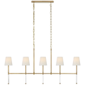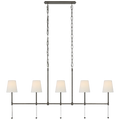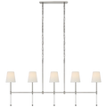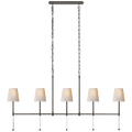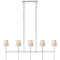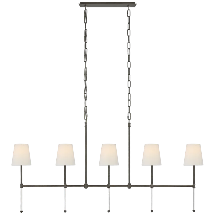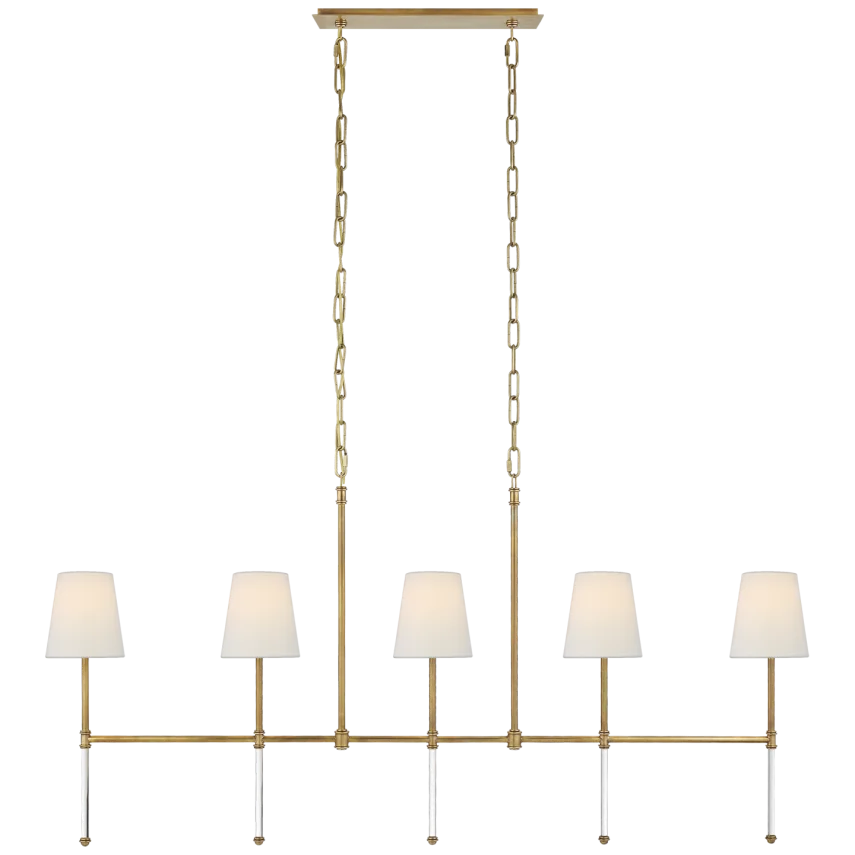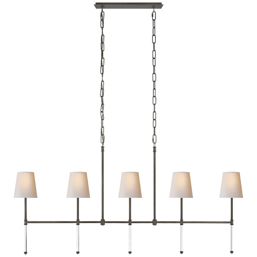 Camille Medium Linear Chandelier comes in hand-rubbed antique brass, bronze, and polished nickel with either natural paper or linen shades.