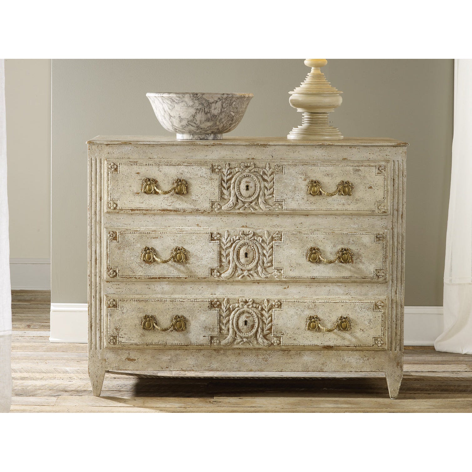 Beautiful hand carved wooden chest with 3 drawers. Distressed, antique white paint and brass pulls.