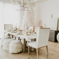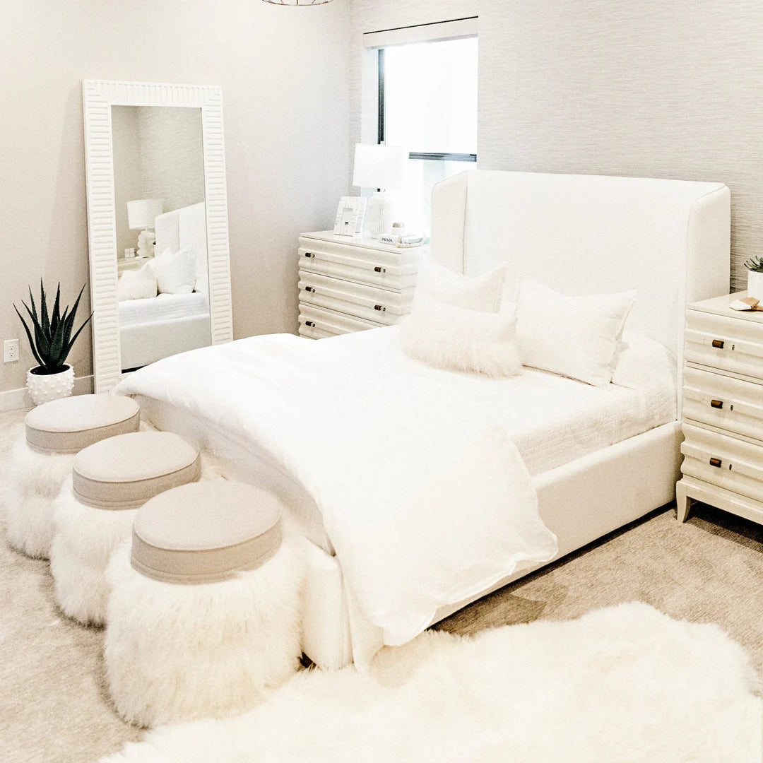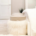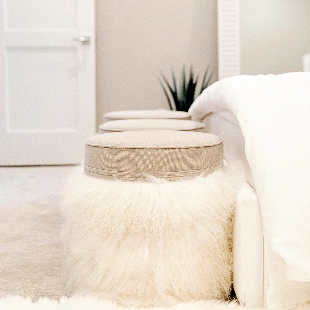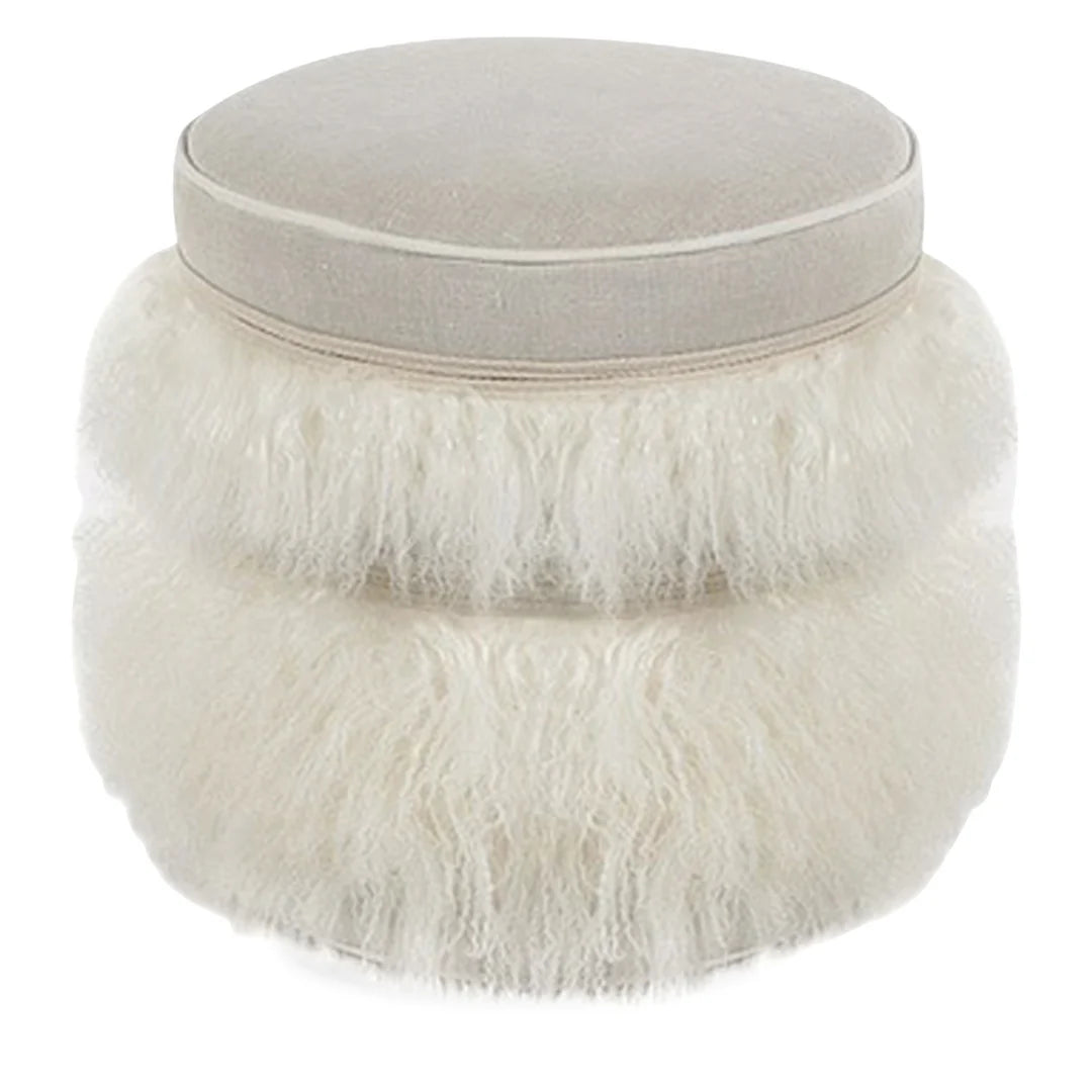 This Fluffy and chic pouf provides a comfortable multi-use piece for your home. White fur is topped with oatmeal linen creating a luxurious ottoman. This can be used as additional seating or as a foot rest.