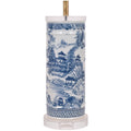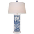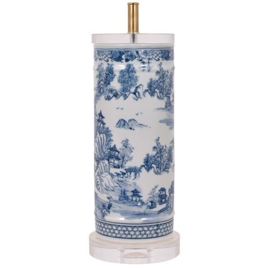 Cylindrical lamp with a blue and white canton pattern. The round shade and crystal base and cap give the classic blue and white an update.