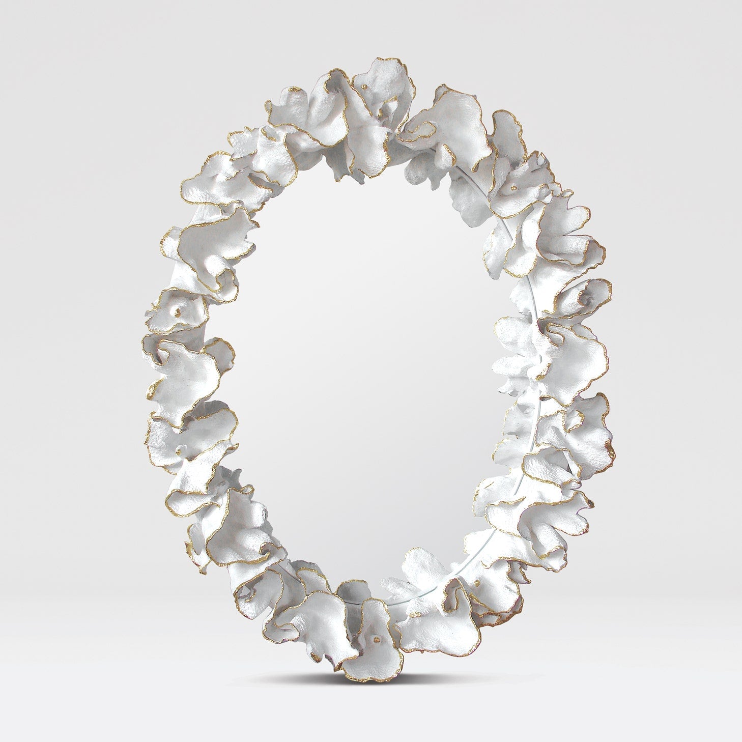 Leaf coral was the inspiration for this remarkable piece. Hours of molding and hand painting are necessary to fashion the Coco's undulating oval of white coral. For a less casual interpretation, a thin silver or gold tip is applied to the end of each ''leaf.'' This mirror has a ruffled frame with an approximate 6'' depth.