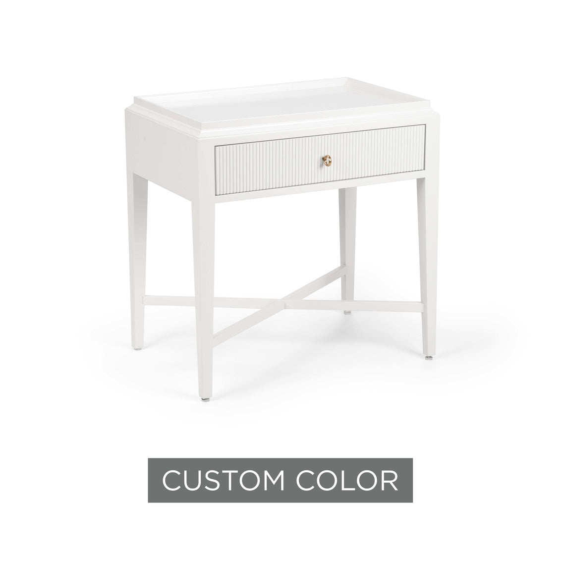 Classic style and function, cottage nightstand is a perfect bedside companion. This wooden table has one reeded drawer with a brass finished circle pull that provides a place for the remote, reading materials or other small items. If can be custom painted in customer's selection of any Benjamin Moore paint color. Please provide color name and number. Also available in nickel finish as an alternate hardware option. Not intended for clothes storage.