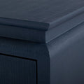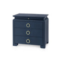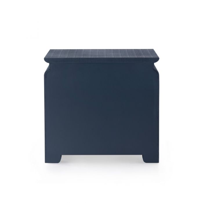 Hand-wrapped lacquered linen brings a modern, luxurious feel to the Elina 3-Drawer Side Table. Three drawers provide ample storage, and a pull out tray is the perfect place for storing a cup of tea or a drink. This versatile piece is as much at home as a bedside table, placed upon a landing, or as a stylish accent piece in a study or a den. The curved chow feet, our modern take on classical Chinoiserie, brings a whimsical and exotic feel to this piece. What we love about the Elina 3-Drawer Side Table: Our artisans use a medium gloss lacquer on the luxurious finish which softens the piece and gives it a romantic feel. Pigmented Lacquered Heavy Linen and Curved fee in Lacquer; comes with Owen Pull in Polished brass; Pull out tray shelf with wooden glides, veneer drawer interior.