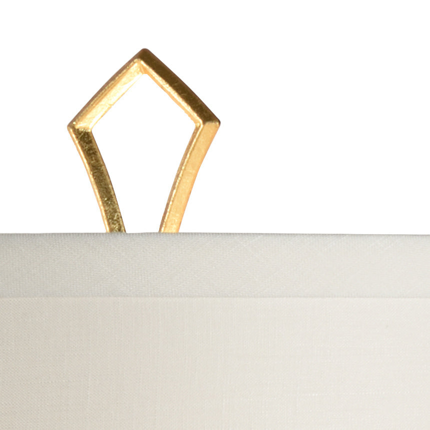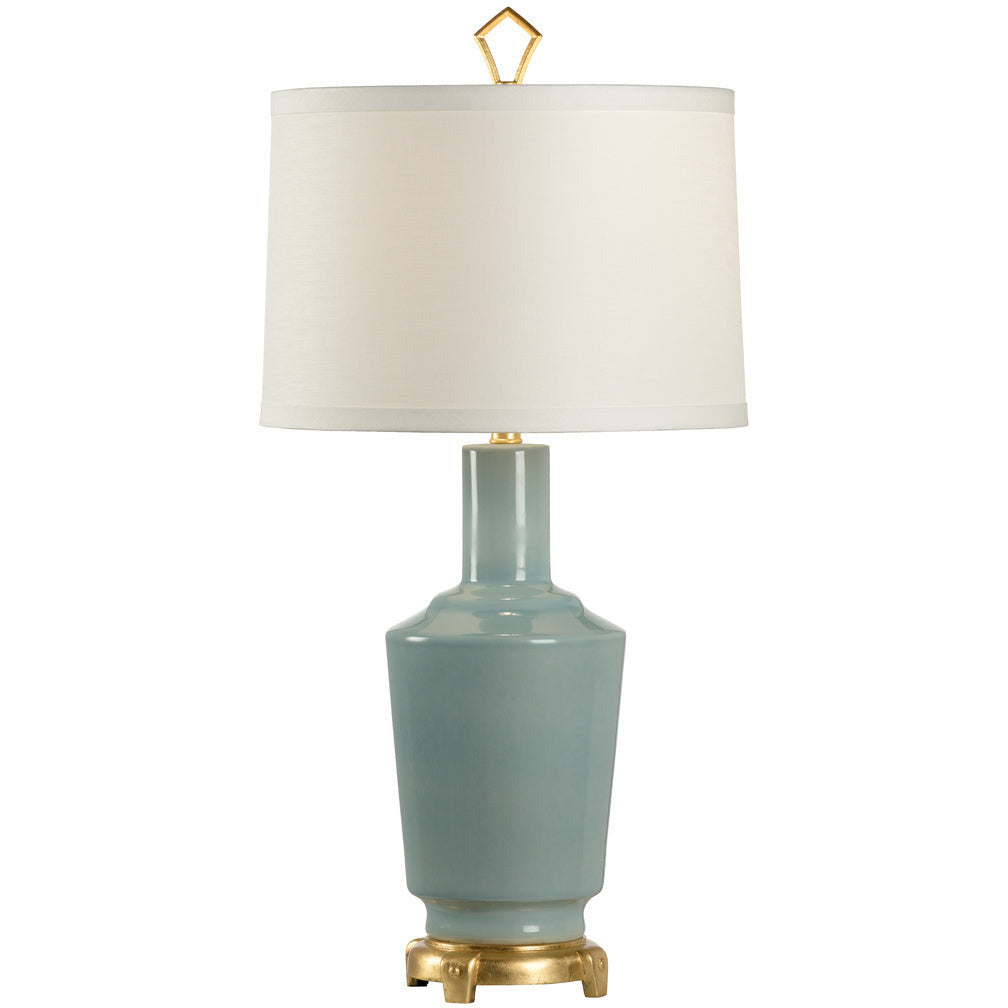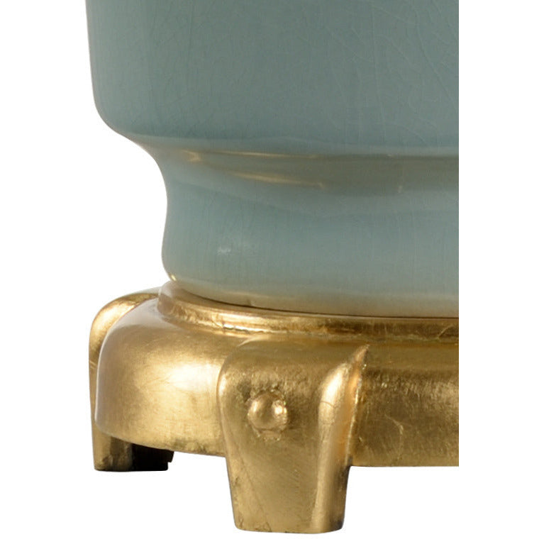 Wildwood ceramic lamp with a sea mist glaze finish, antique gold leaf mounting and an ivory linen shade. 7"w x 7"d x 32"h. Max wattage: 100. Switch type: 3-way. Brought to you by deGuise Interiors. Brought to you by deGuise Interiors.