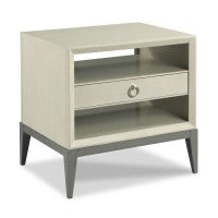 Crafted from hardwood solids and painted in two hues, Sahara and Graystone finished bedside table. Rectangular table top rests over two open compartments and a middle drawer. Graystone finish Sahara Finish Base 28''W x 22.5''D x 29.5''H