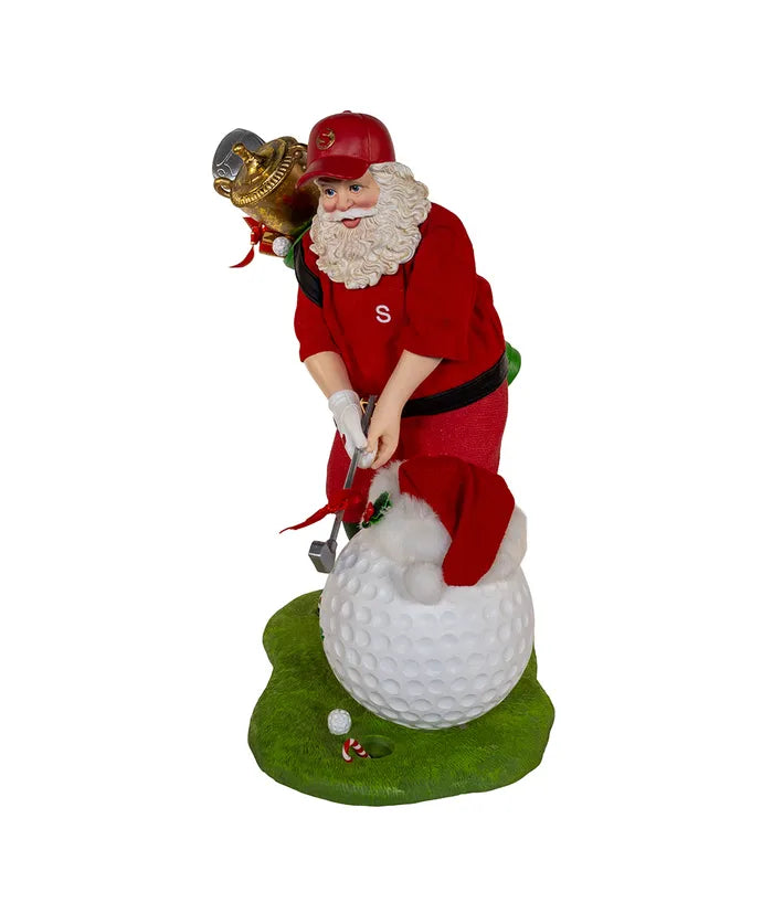 Kurt Adler's 11" Fabriché™ Golfer Santa With Oversized Golf Ball, a charming and sporty addition to your holiday decor that combines the beloved traditions of Santa Claus with the enthusiasm for golf. Crafted with meticulous attention to detail, this unique figurine celebrates the joy of the game and the festive spirit of the holiday season. Standing at a delightful 11 inches tall, this Fabriché™ figurine features Santa Claus dressed in a red golf outfit with a red cap, but with a playful twist. Santa is captured mid-swing with a golf club in hand, ready to take a shot with an oversized golf ball that's nearly as big as he is. His cheerful facial expression and dynamic pose capture the excitement and spirit of the golf course. Place this table piece on your mantel, tabletop, or as a centerpiece in your holiday display to celebrate the love of golf and the playful side of Santa Claus. Whether you're an avid golfer or simply want to add a touch of sporty fun to your holiday decorations, this figurine is a lighthearted reminder of the joy of the game and the spirit of the season.