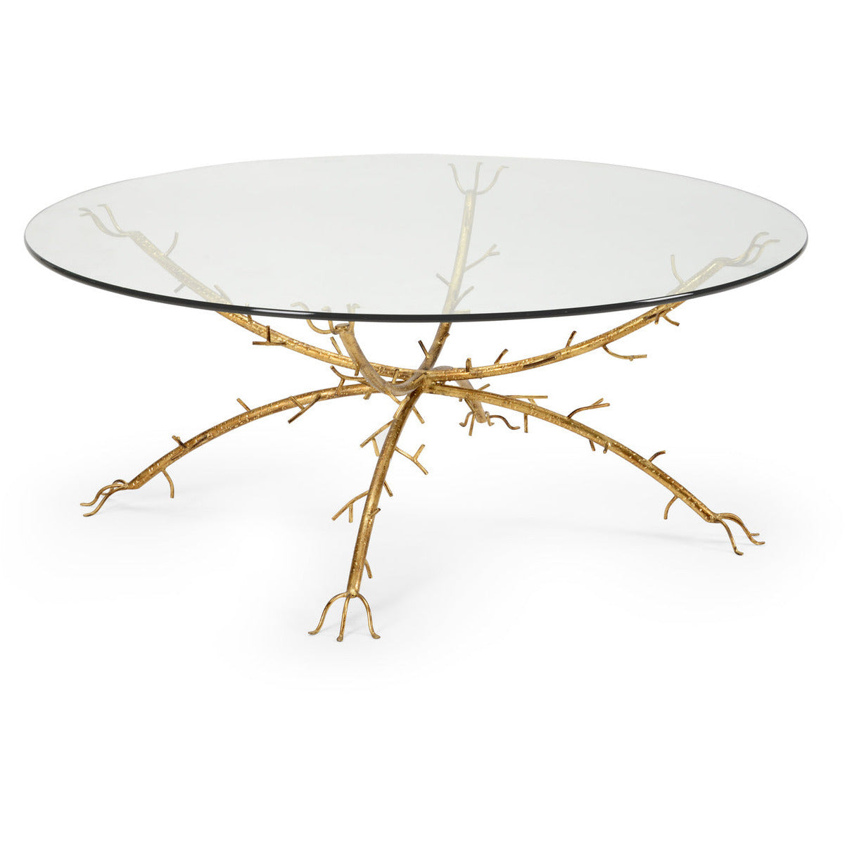 Chelsea House cocktail table with an antique gold lacquered iron base with a clear plain glass top. 47.8"w x 47.8"d x 19.8"h. Brought to you by deGuise Interiors.