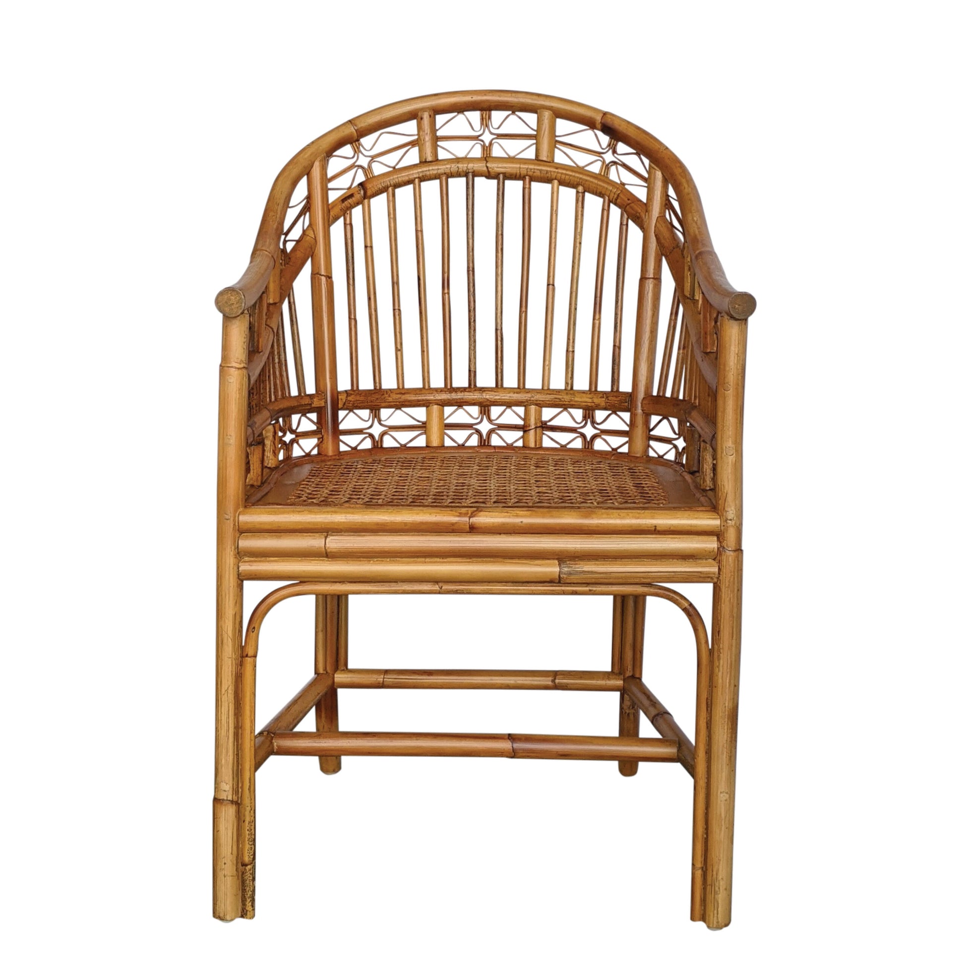 A Indochine Horseshoe Armchair made of rattan and woven cane. Available in multiple finishes. Shown in vintage cane stain. **Please allow 4-6 weeks for lead time of stocked item. If item is out of stock, we will notify you with a direct lead time.**
