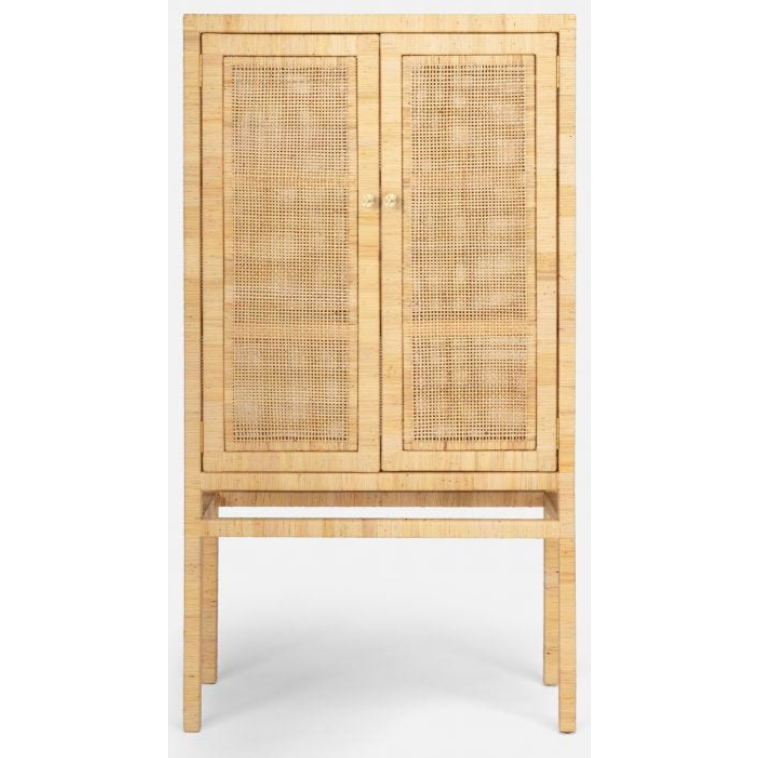 A tightly wrapped, natural peeled rattan frame complements the dense basket weave of the natural peeled rattan sides and the slightly looser basket weave of the doors. Four fixed wood shelves, with tightly wrapped natural peeled rattan edges that mirror the cabinet’s exterior structure, complete its welltailored design and includes lower-patterned gold knobs.