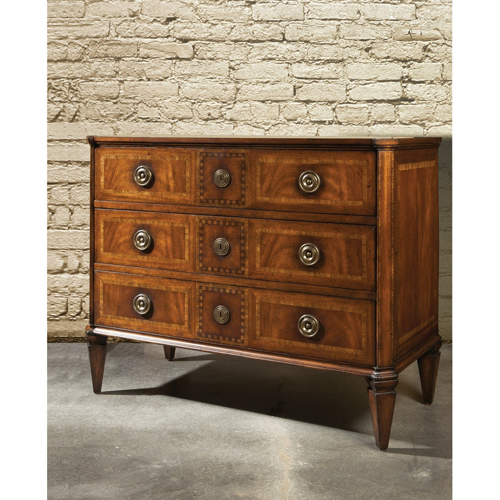 An Italian Chest with an ebony inlay and a European mahogany golden brown finish. This chest is made of mahogany timber and contains three drawers, tapered legs and inlay posts. Italian Mahogany timber. Inlay Chest. Golden brown finish. tapered legs. Three storage drawers. 46w x 20.5d. 36.75h.