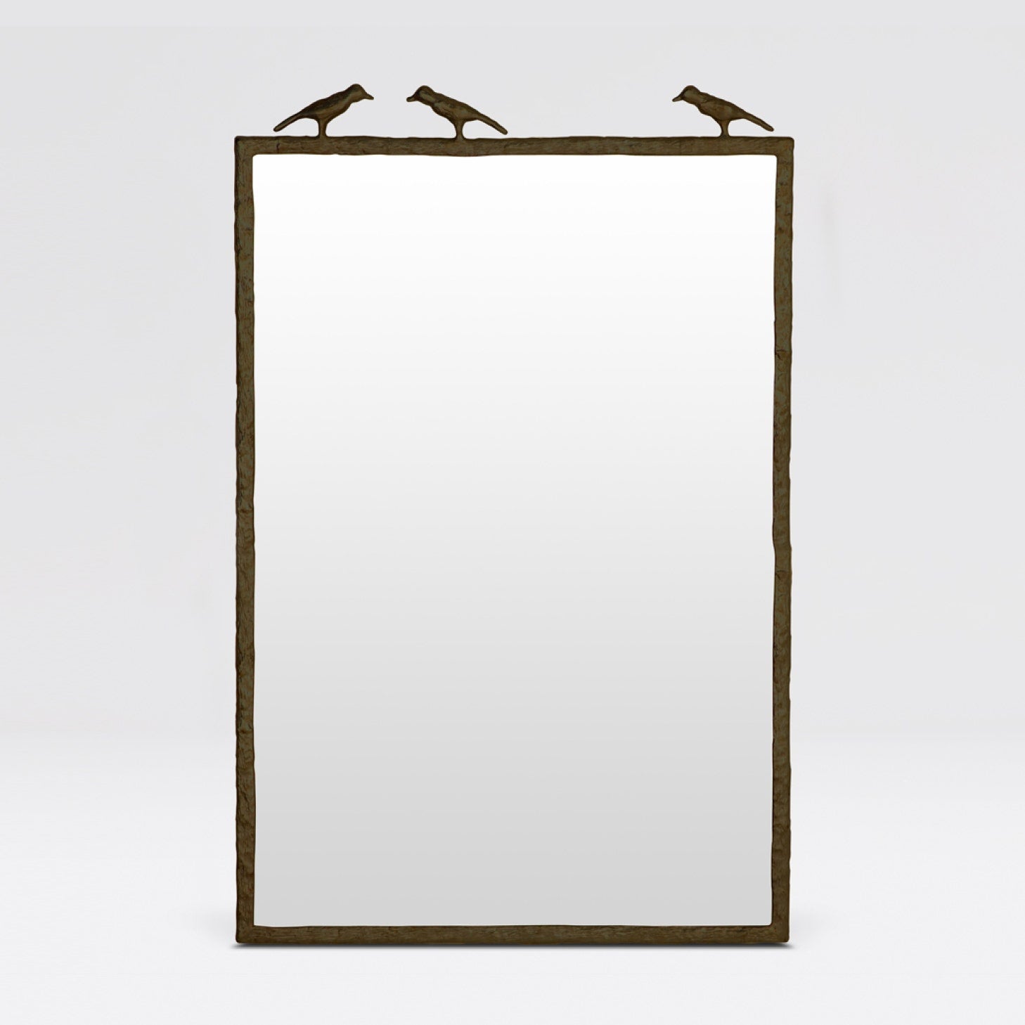 This mirror is bordered in textured metal reminiscent of wood grain. Small sparrows perch on top.