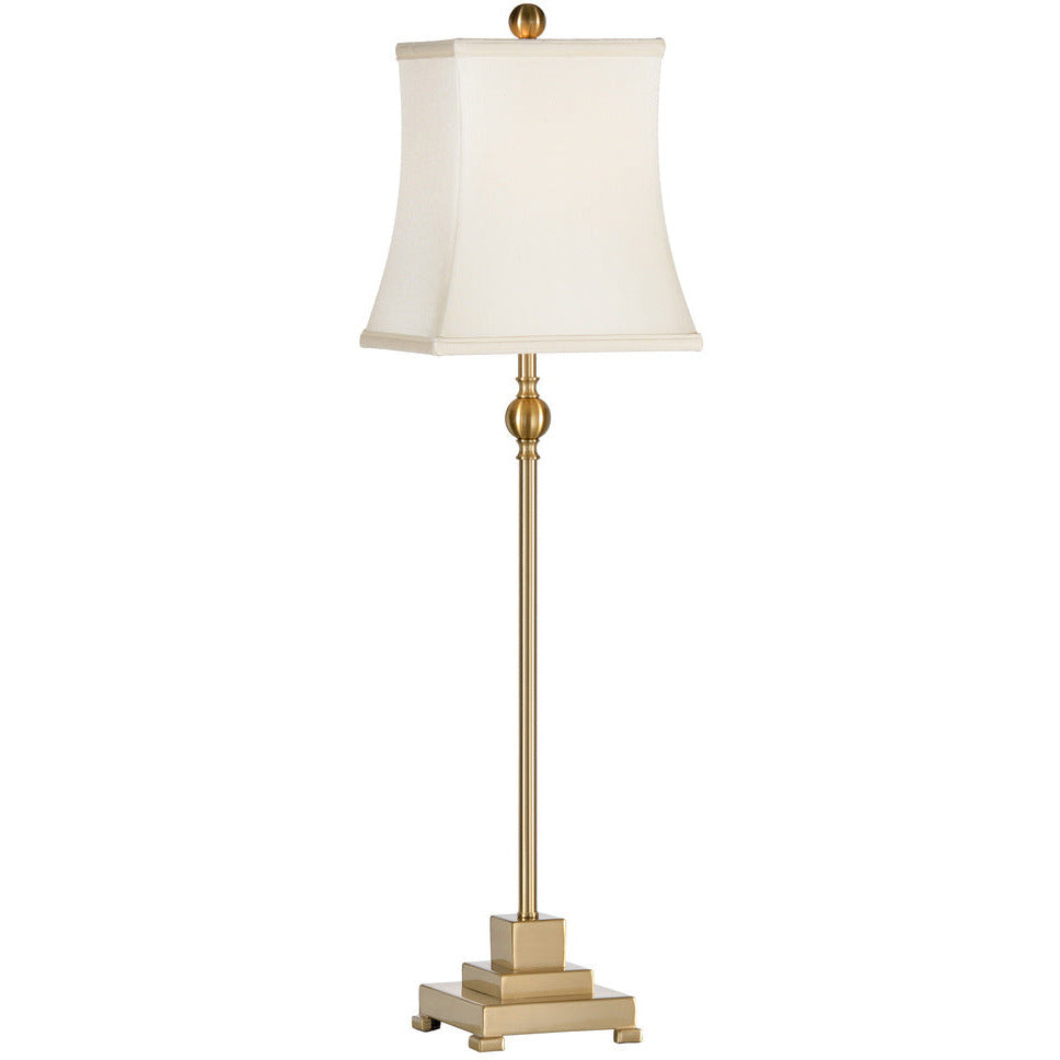 Standing 34"h this metal buffet lamp from Chelsea House comes in an antique brass finish. Shade is silk in a cloud cream color. Max wattage: 100. Switch Type: 3-way. Brought to you by deGuise Interiors.