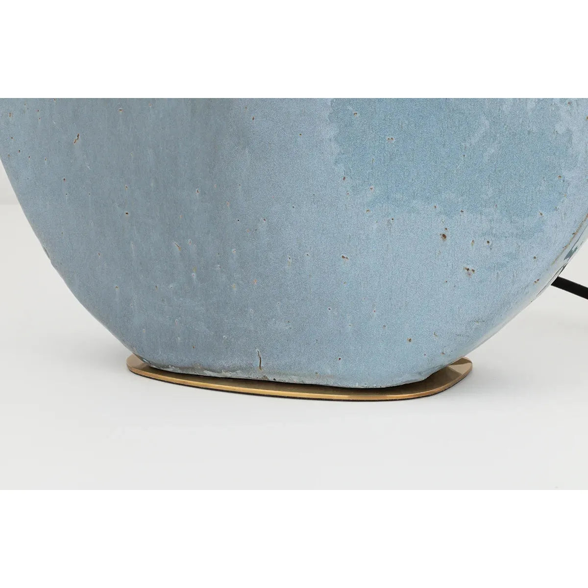 Striking blue grey lamp with white linen shade.