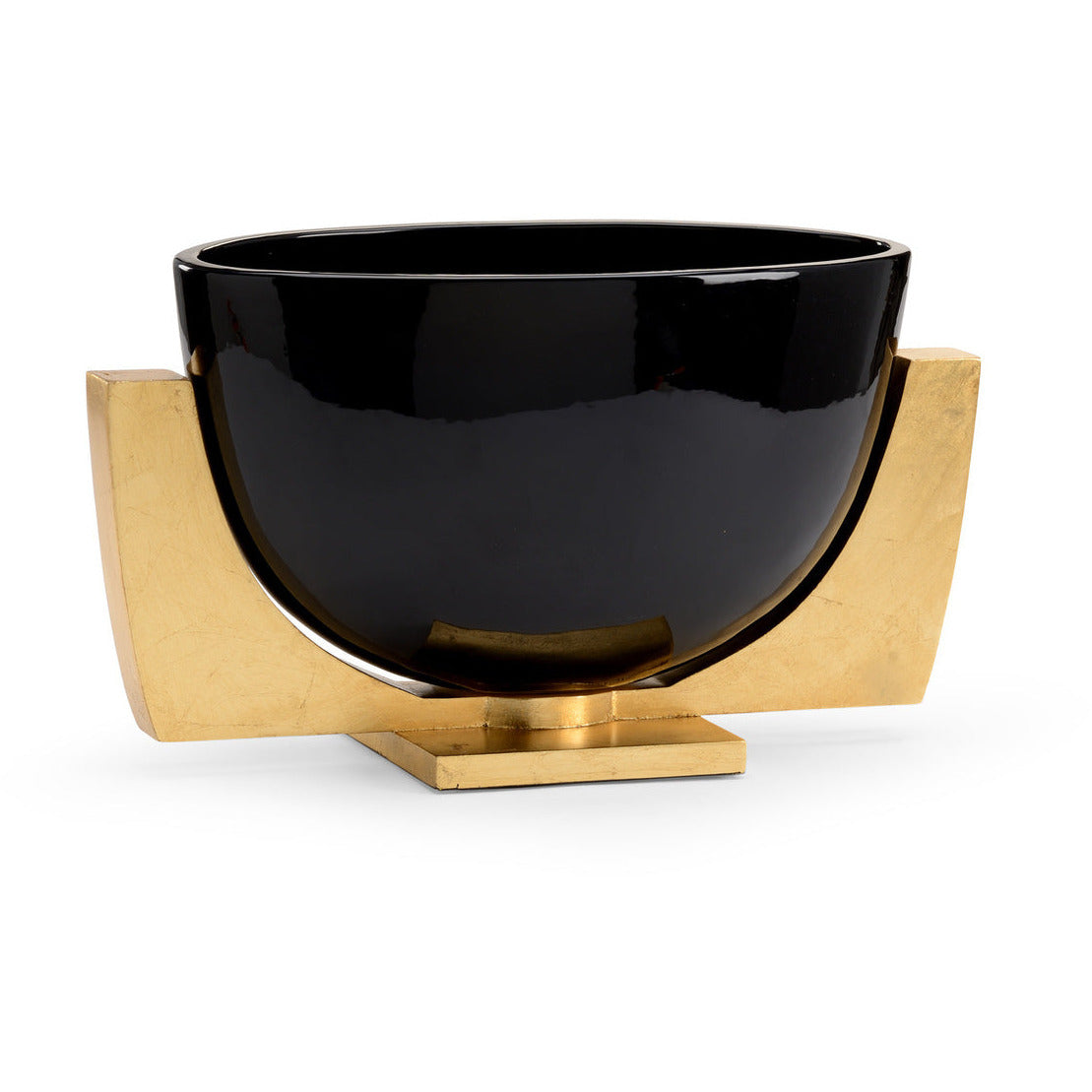 The Lander Bowl from Chelsea House is a black porcelain bowl with an antique gold leaf iron stand. 15.1"w x 6.8"d x 9.5"h. Brought to you by deGuise Interiors.
