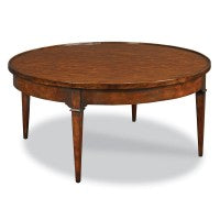 A circular cherry top acacia solid and cherry veneer cocktail table. Contains shaped apron rails and tampered chamfered posts. Bordeaux Finish. 36''W x 19.5''H