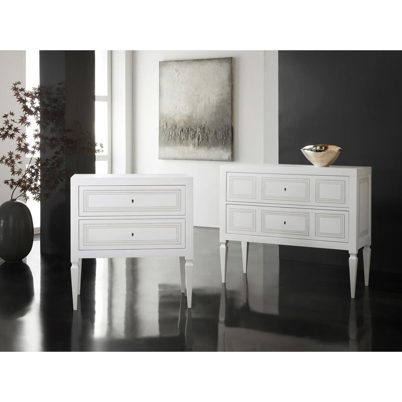 Beautiful petite chest with a concentric design and two locking drawers. The chest is available in fruitwood, grey paint with ivory accent, and white linen with grey accent. *Check for availability for each finish*