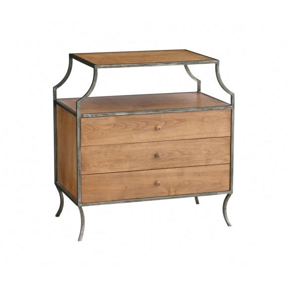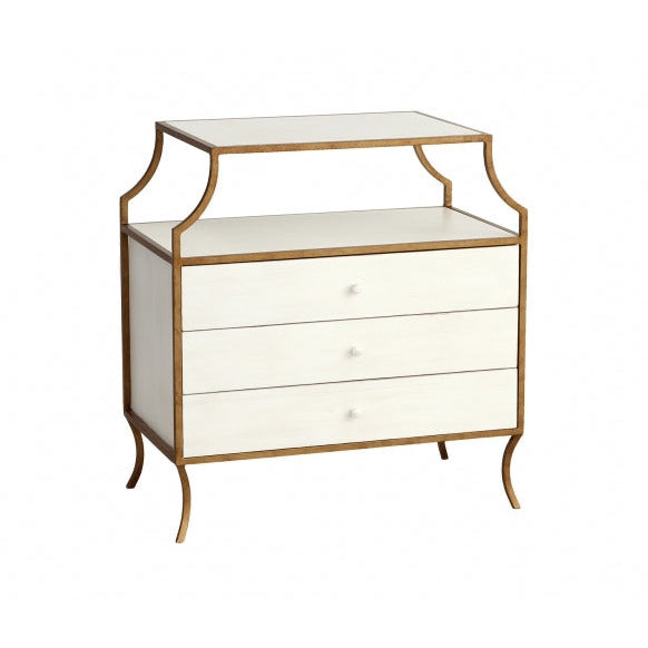 The Milla Side Table with Drawers features 3 wood drawers and saber legs. Iron base available in antique gold, antique silver, and blackened iron. Shown in Raw Cotton/Antique Gold and Almond/Antique Silver.**The lead time on this item is approximately 8-10 weeks. This is a special order item and is not eligible for return or refund.** curved saber legs, hardwood storage w 26" d 25" h 27.5"