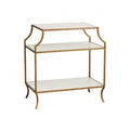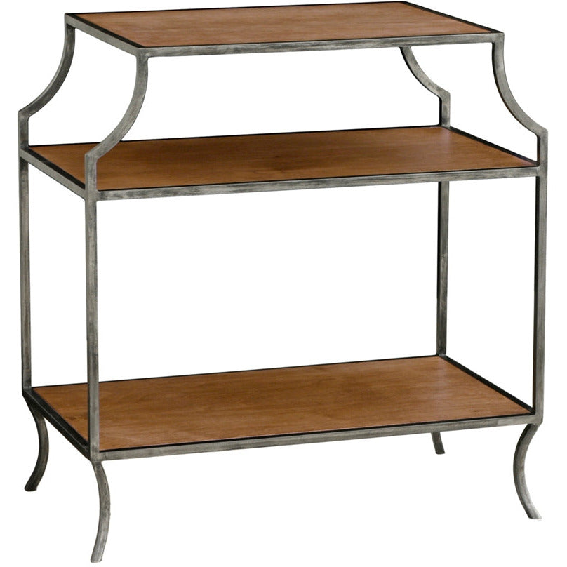 This elegant side table features three wooden tiers, a metal frame, and saber legs.**The lead time on this item is approximately 8-10 weeks. This is a special order item and is not eligible for return or refund.** w 26" d 15" h 27.5"