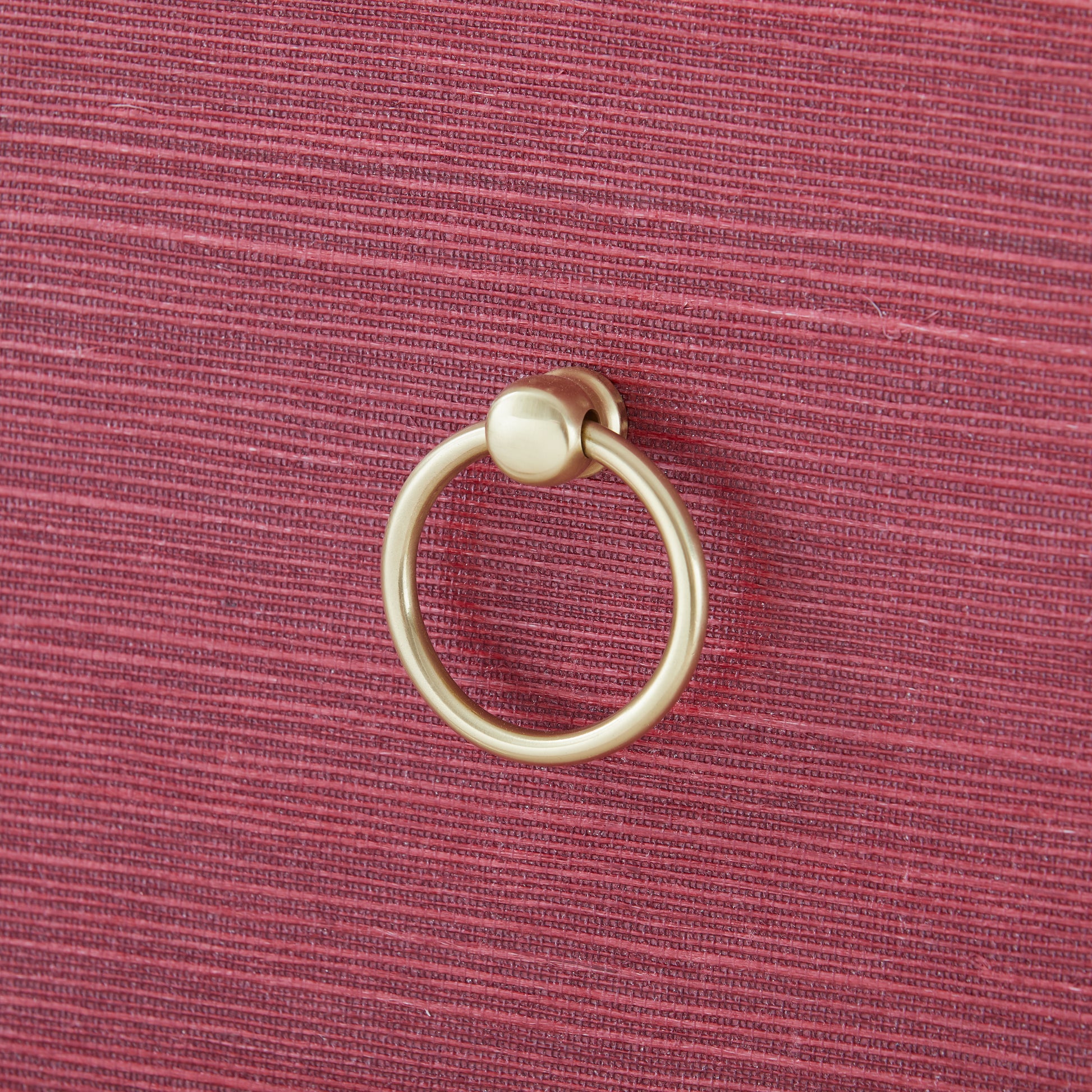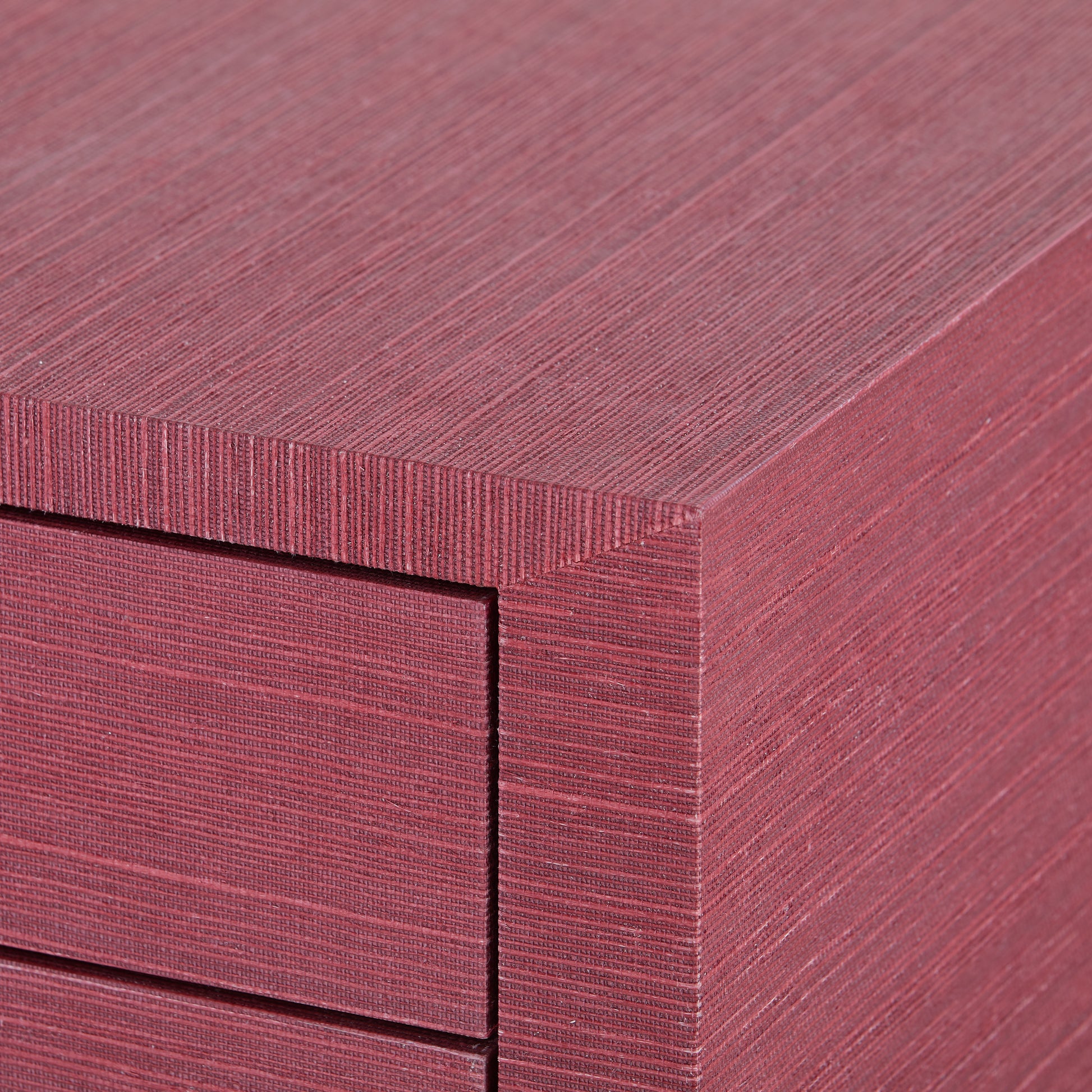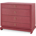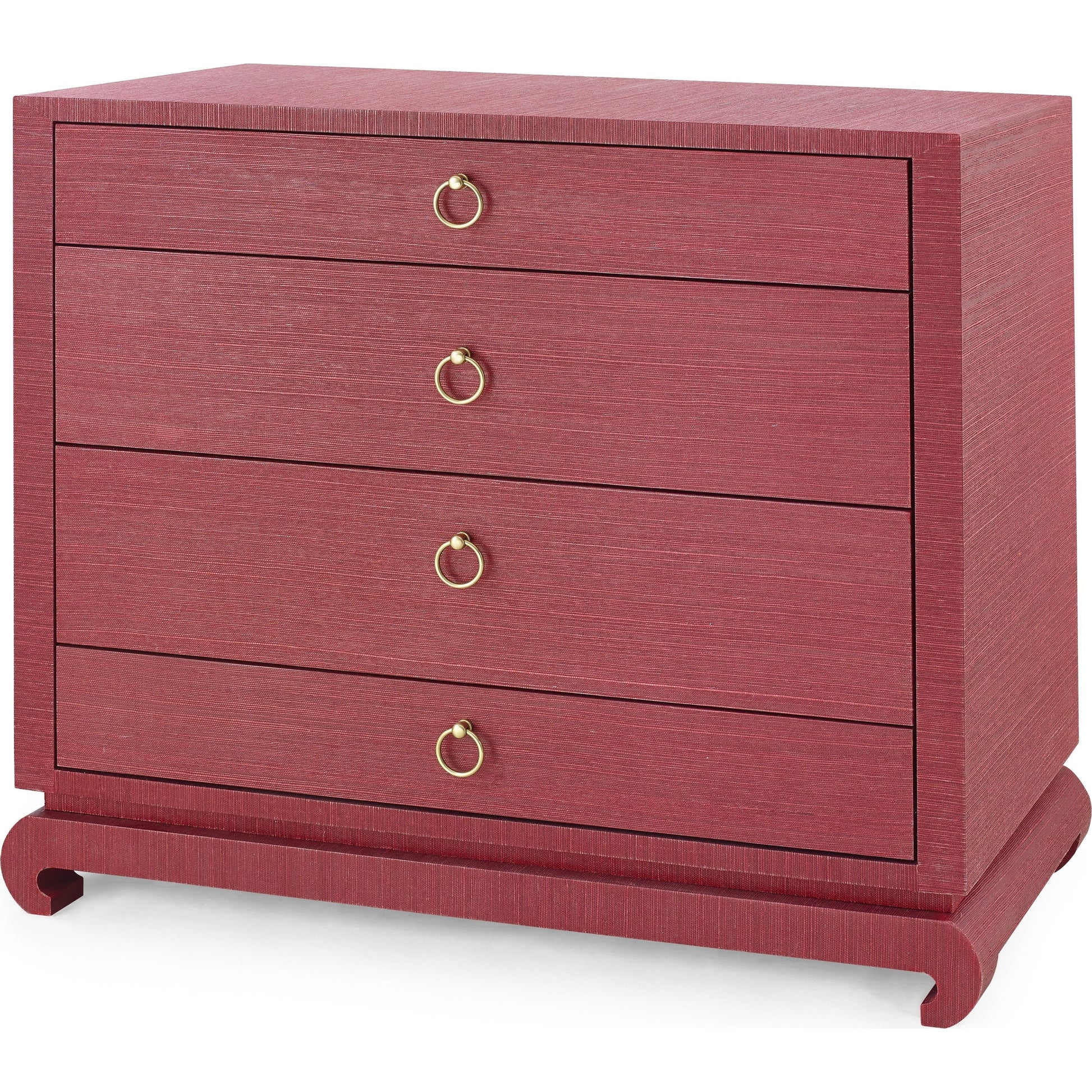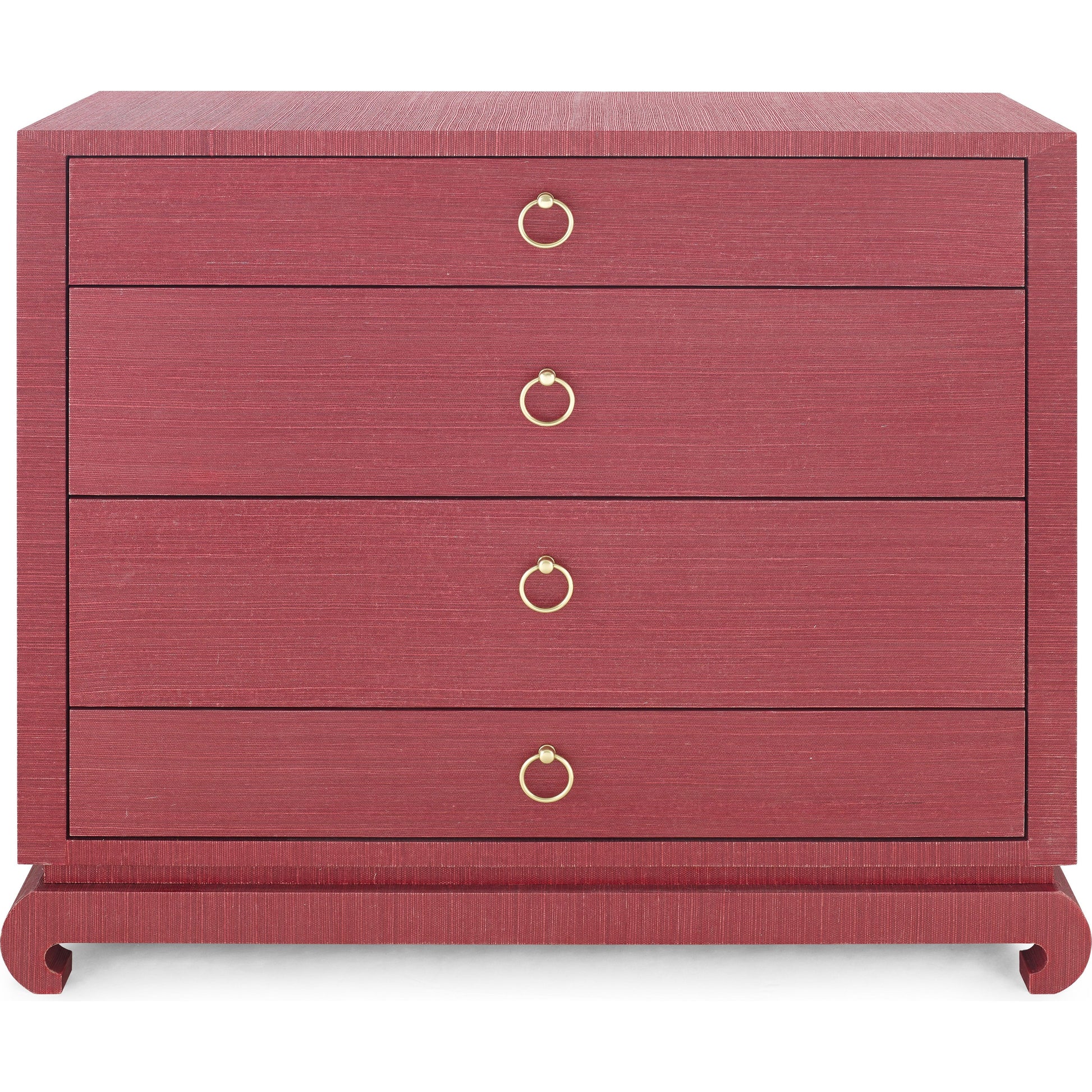 The stately pieces of our Ming Collection radiate worldly sophistication and contemporary class. Handsomely tailored in both form and finishings, the Ming Large 4-Drawer in Red boasts an elegant silhouette, soft corners, and thoughtfully-applied details, such as a podium base and delicately curved Chow-style feet. Four drawers make up its facade, each adorned with polished brass ring pulls and rich stained wood interiors. Draped in lush, textured grasscloth with a lacquered finish, the Ming elevates its surroundings with its refined presence. It’s the perfect storage solution in a living room, bedroom, or study.