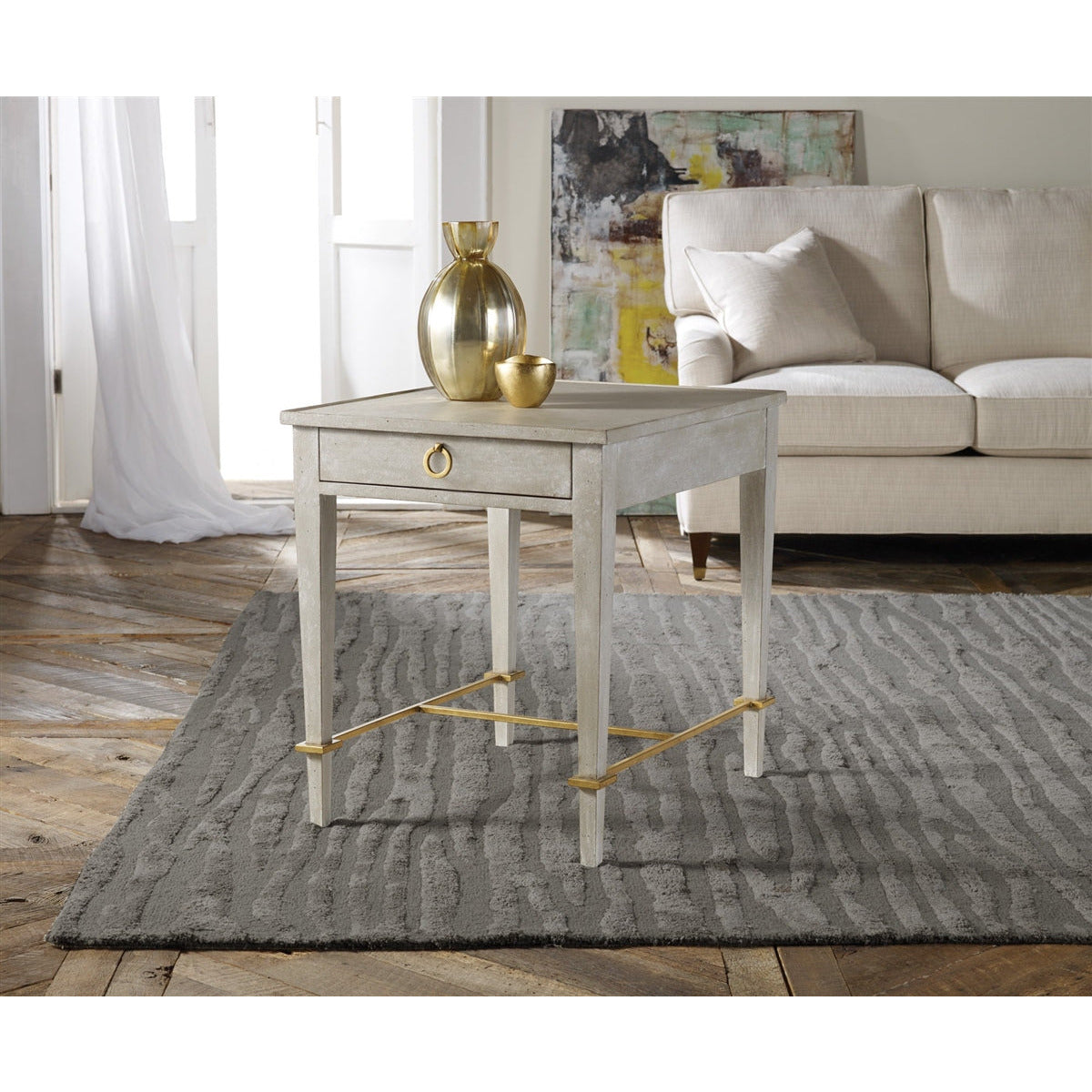 Contemporary side or lamp table with gold leaf finished stretchers and brass drawer hardware. Antique grey finish with gold leaf and brass hardware w 22" h 27" d 26.75"
