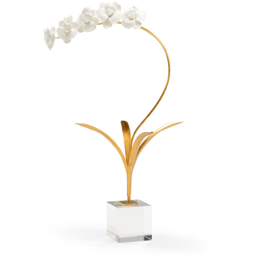 Chelsea House white porcelain orchid with an antique gold leaf iron stem mounted on a crystal base. 15"w x 12.3"d x 23.5"h. Brought to you by deGuise Interiors.