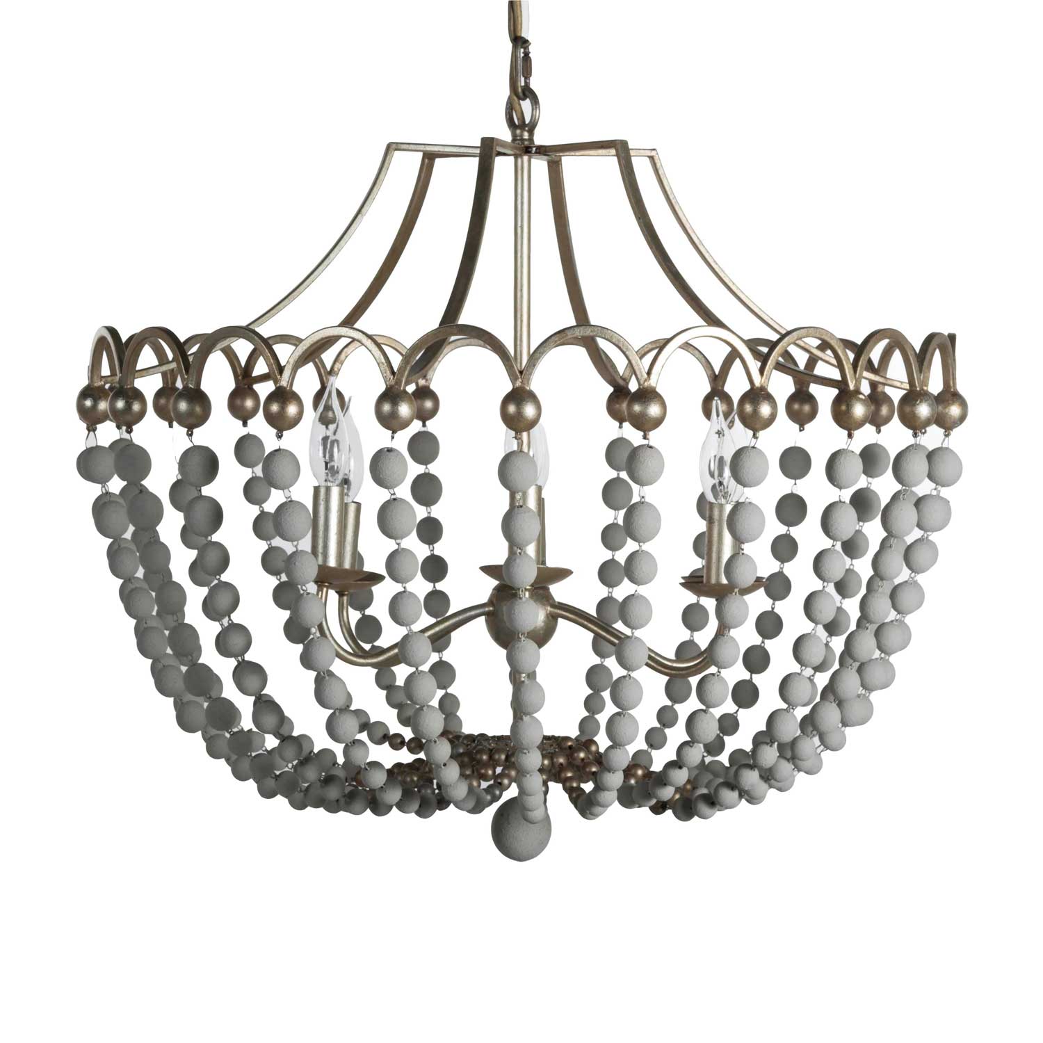 6 bulb chandelier with Champagne Silver and Dove White finish and cascading wooden beads. Max wattage: 60