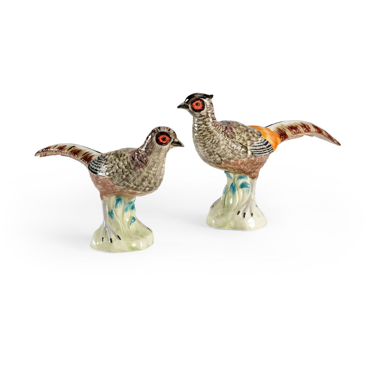 Hand-colored, Euro ceramic pheasant figurines from Chelsea House. Sold as a pair. 15"w x 4.5"d x 8.8"h. Brought to you by deGuise Interiors.