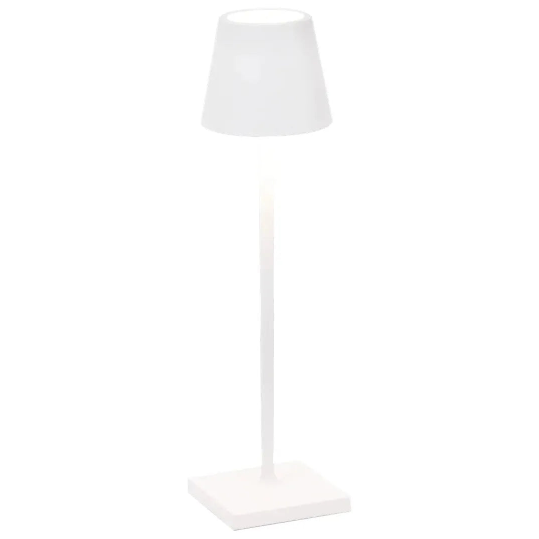 Includes contact charging base, Rechargeable and replaceable lithium-Ion battery pack lasts approximately 400 charging cycles. Order replacement battery packs from Zafferano America., Battery lasts about 6-7 hours at full power, Charging time is 3-4 hours, Suitable for outdoor use (powder-coated finishes only), Plug not included, Polycarbonate diffuser, Full-range touch dimming