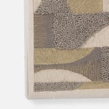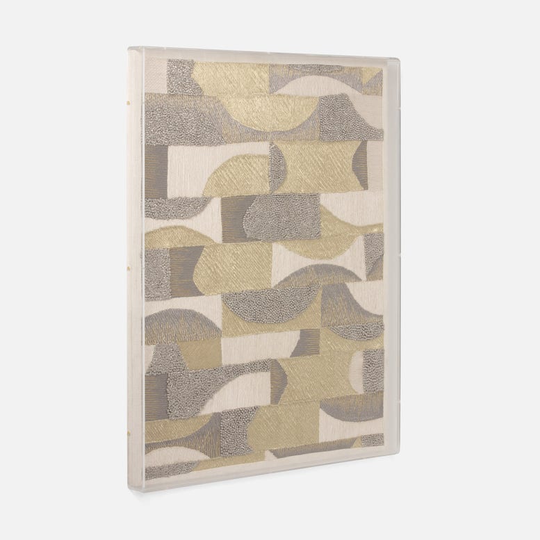 A composition of geometric shapes creates abstract wall art that shimmers with its fabric blend of gold, silver and white metallics.