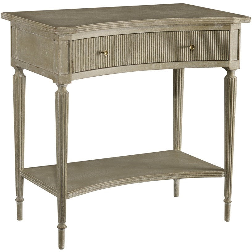 The Ribbed Bedside Table is a stunning table with a curved design. This nightstand table features carved linear lines and accented with brass hardware. The antique gray finish gives this table an amazing textured and aged look with a twist of modern flair. Carved linear lines and brass hardware. w 32" h 32" 19"