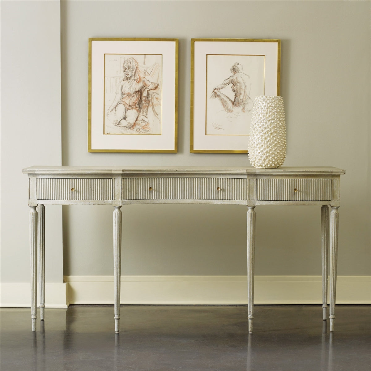 Timeless design and exceptional workmanship build the foundation for Modern History Home's collection of fine furniture. This elegant console table complements an entryway or foyer with a beautifully detailed aeshetic. Atop tapered legs with ridged moldings, this gray, venetian oak furnishing showcases three ribbed drawers with brass drawer pulls. Drawers operate on wooden slides. Tapered legs, three ribbed drawers, brass pulls