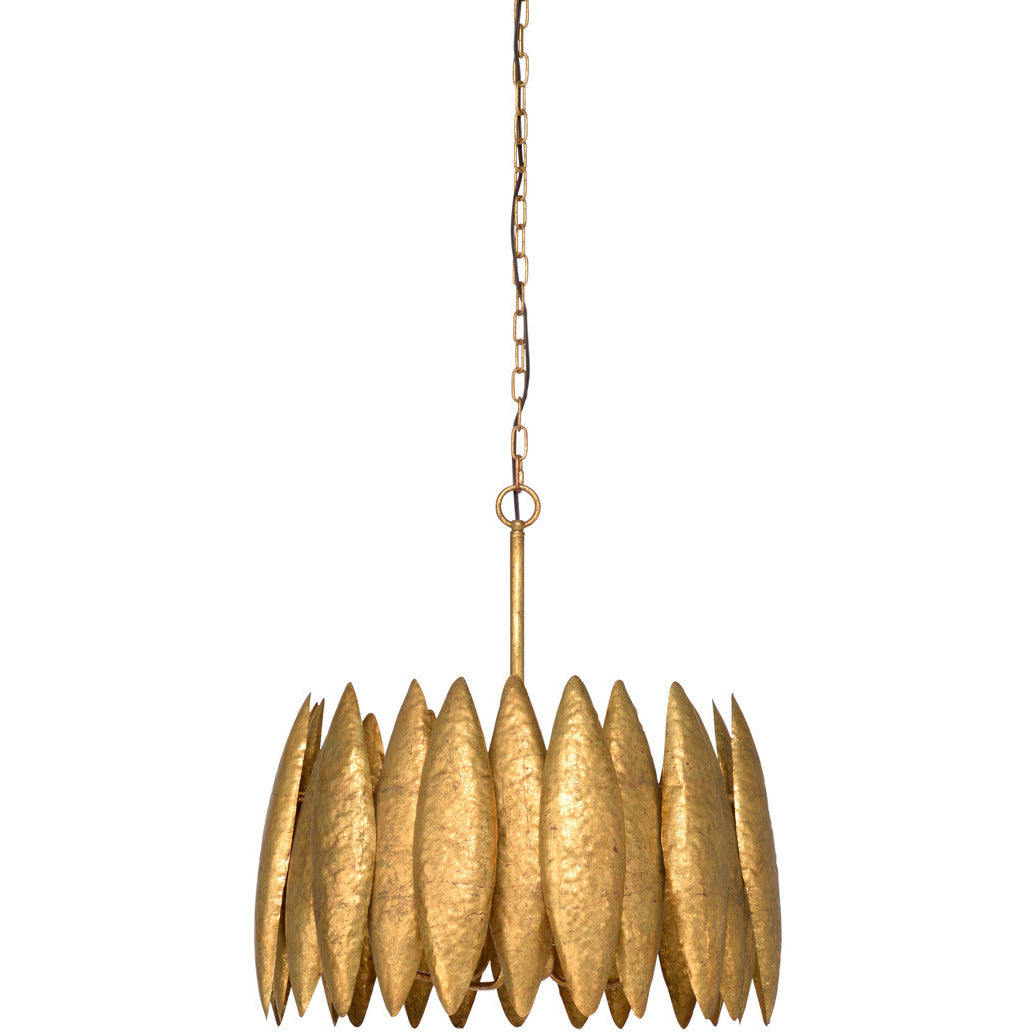 Wildwood antique gold leaf finished chandelier. Comes with 6' of chain. 21"w x 21"d x 25"h. Max wattage: 25. Switch type: hardwired. Brought to you by deGuise Interiors.