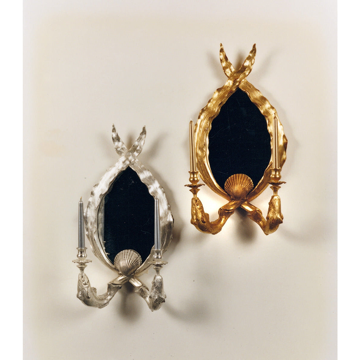 A scallop shell broaches jubilant ribbons of sea kelp while rays of candlelight spout from frolicking striped bass in these festive maritime sconces. Available in an antiqued Gold leaf finish or in Sterling Silver leaf finish.